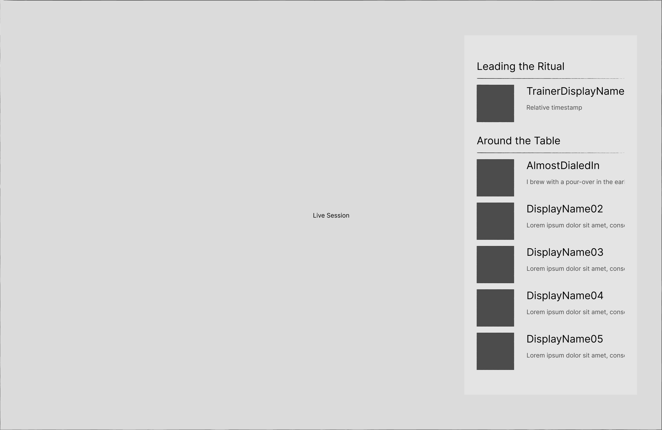 Lightweight, non-video social layer showing attendee names, avatars, and ritual responses