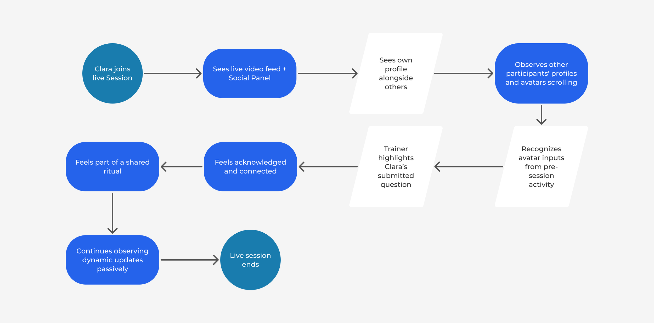 Participant-centered task flows that shape each phase of the Blue Bottle Sessions experience, from curiosity to connection to continued exploration.
