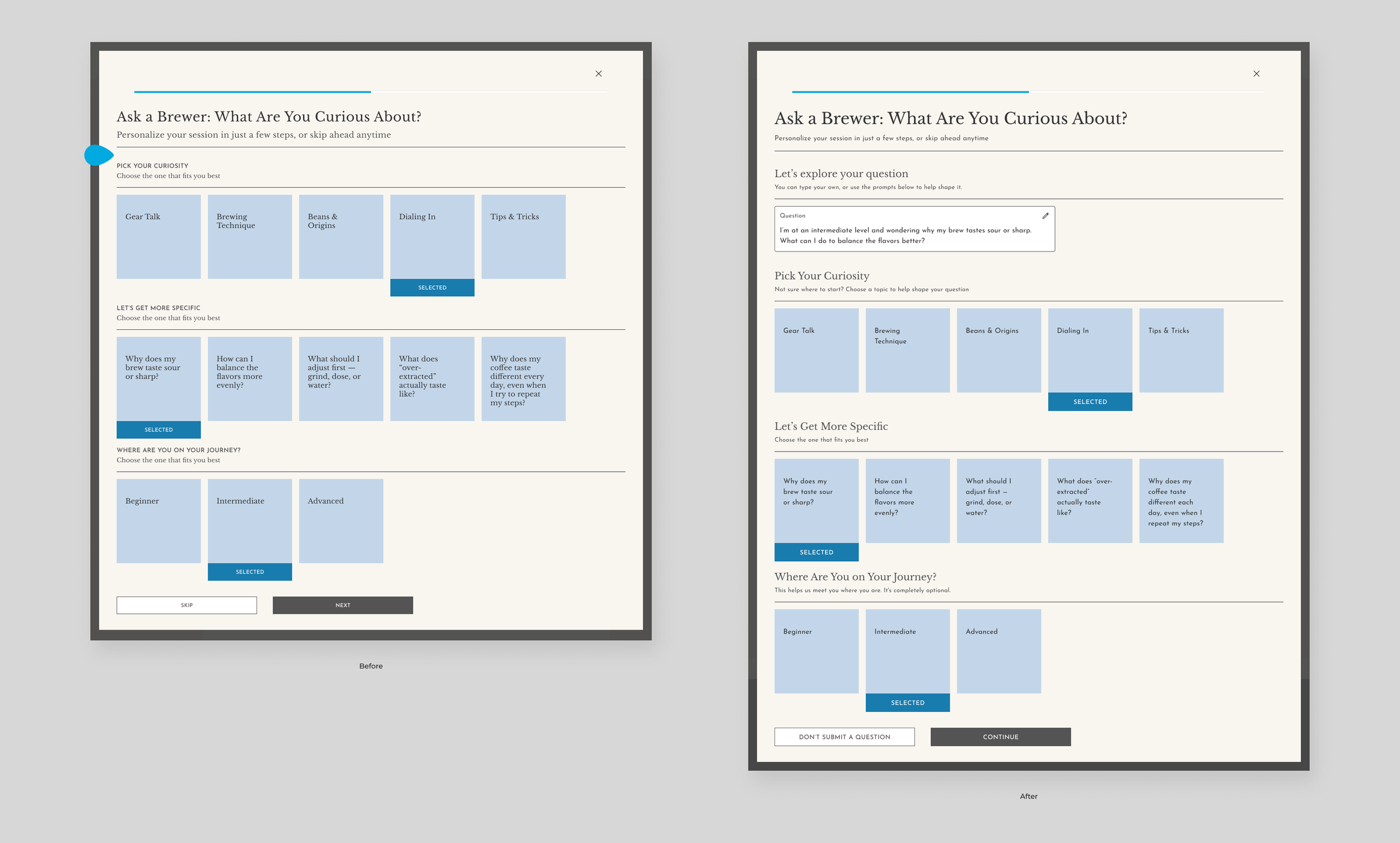 A reflective, guided onboarding flow that helps users share their brewing habits and curiosities before joining a session.